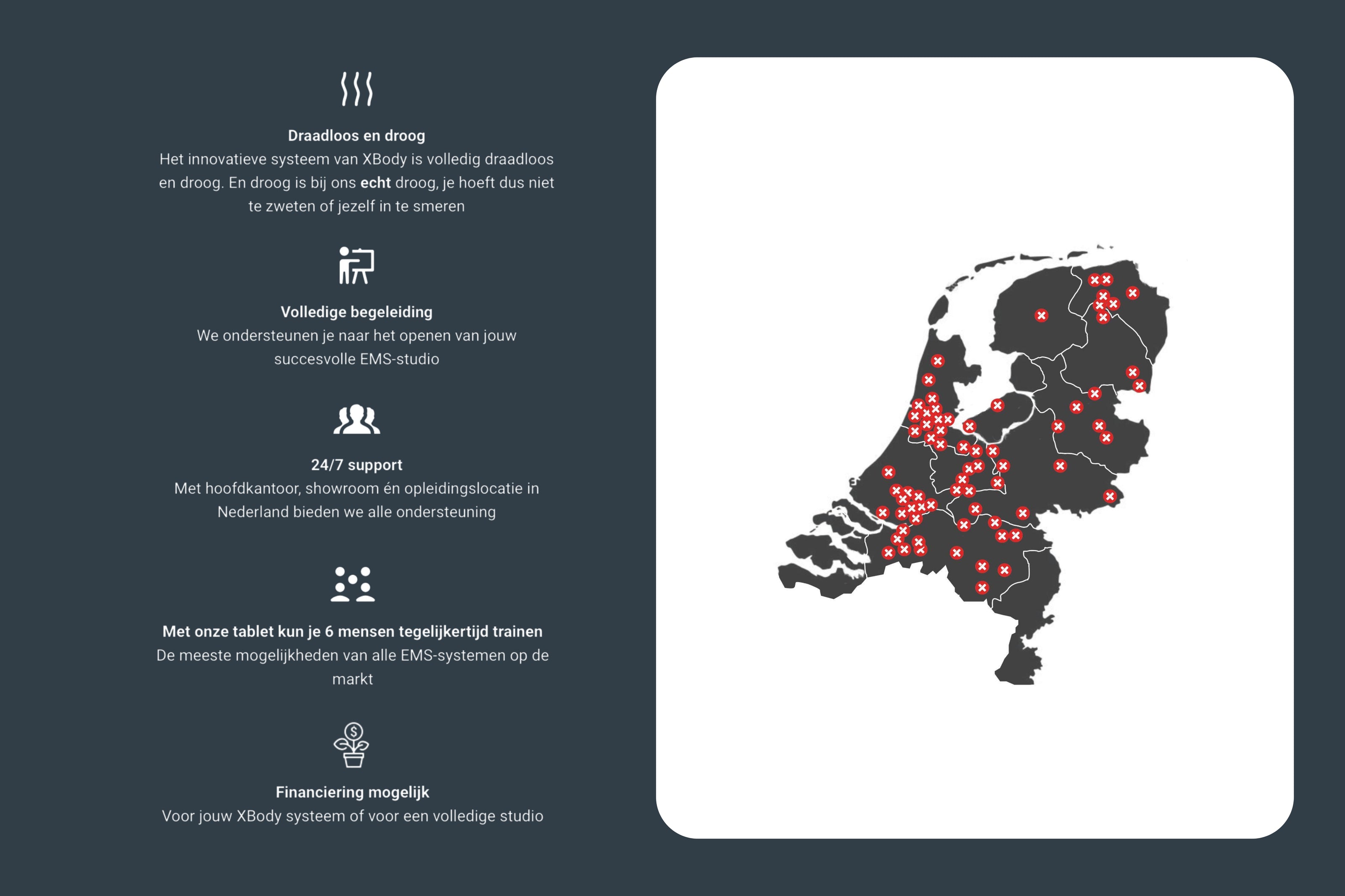 XBody is sinds 2010 de voorloper binnen de EMS en wordt op dit moment in meer dan 5000 ems-studio’s wereldwijd gebruikt waarvan meer dan 85 in Nederland. Met heel veel kennis en praktijkervaring door eigen EMS-studio’s kunnen we jou volledig begeleiden en ondersteunen met jouw eigen studio
